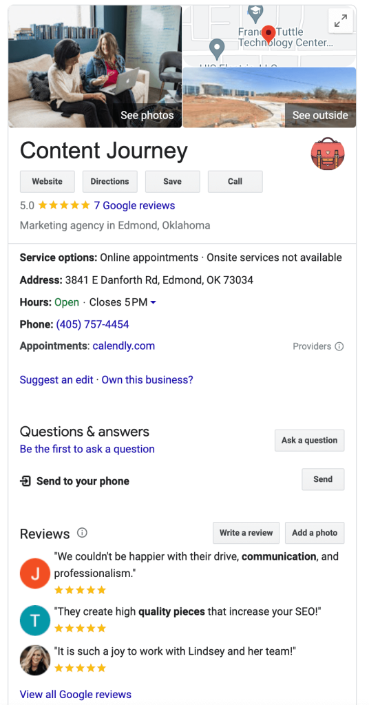 Search engines can be your best friend when it comes to promoting your mental health treatment center. You just have to learn how to harness the power of search. Whether you’re just starting out with your Google Business Profile or need assistance with SEO content writing services, Content Journey is here to help. Schedule a call today to start your journey.